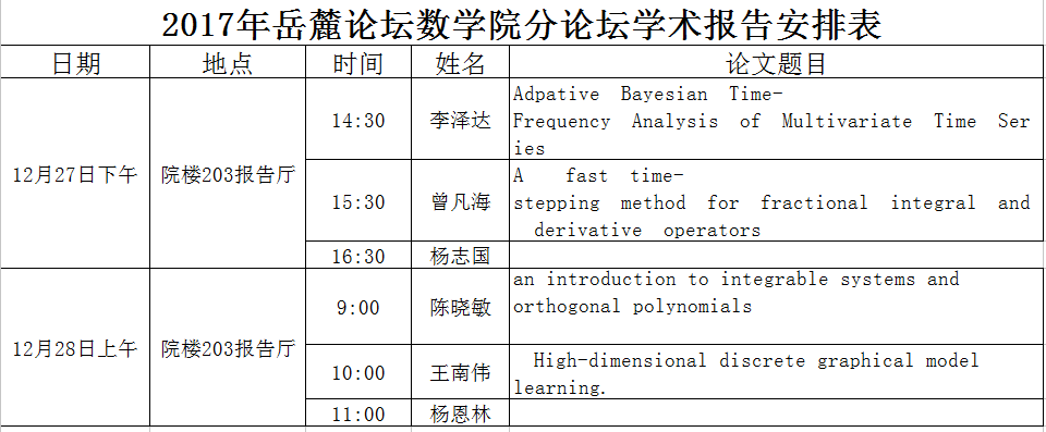 各位老师,27、28号岳麓论坛数学院分论坛在学院203举行,感兴趣的老师欢迎来203听报告!