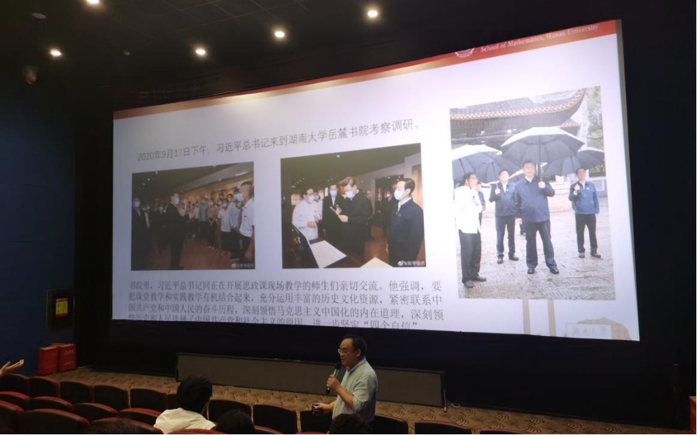 岳麓书院的情况,原汁原味的传达了习近平总书记对湖大学子的殷切嘱托,分享了学院2017级本科生刘逸涵疫情期间帮助湖北尤其是武汉孩子们撑起一张线上的书桌的典型事迹,勉励全院师生,立足本职,不忘初心,做出力所能及的贡献。