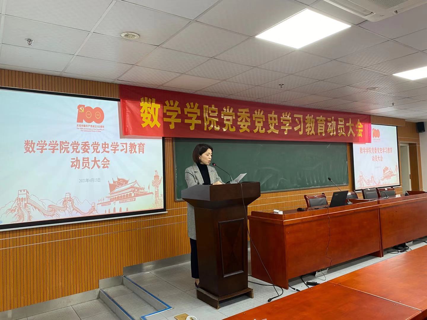 随后,党委副书记熊雅同志部署学院党史学习教育重点任务及推进计划。学院按照“学百年党史、知红色校史、育时代新人、建一流大学和一流数学学科”四个版块协同推进党史教育活动,认真做好“党员自学”、“集中学习研讨”、“专题党课”等17项重点任务,结合学院实际,开展“党务干部专题培训”、“数学课程思政建设”、“数学人精神凝练”等特色活动。