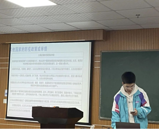第一组由陈豪同志进行分享,该小组讨论主题是疫情防控。由全球疫情背景展开,用中国和其他国家防疫数据及政策来突出疫情形式严峻以及各国对疫情的重视,之后重点普及我国疫情防控措施,以美国的情况得出躺平不可取以及躺赢不可能的结论。