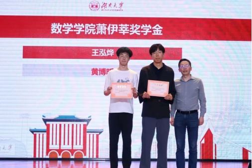 泥巴影视 第九届励志人物和2022年各项奖学金的表彰大会于5月28日在学校的天马小剧场举行。由海外校友郑力刚、全辉、周建平等捐资设立的“萧伊莘奖学金”2022年度的获奖者为信息与计算科学1901班的王泓烨和数学2101班的黄博昕两位同学。颁奖会上,副院长雷渊教授为他们颁发了获奖证书。