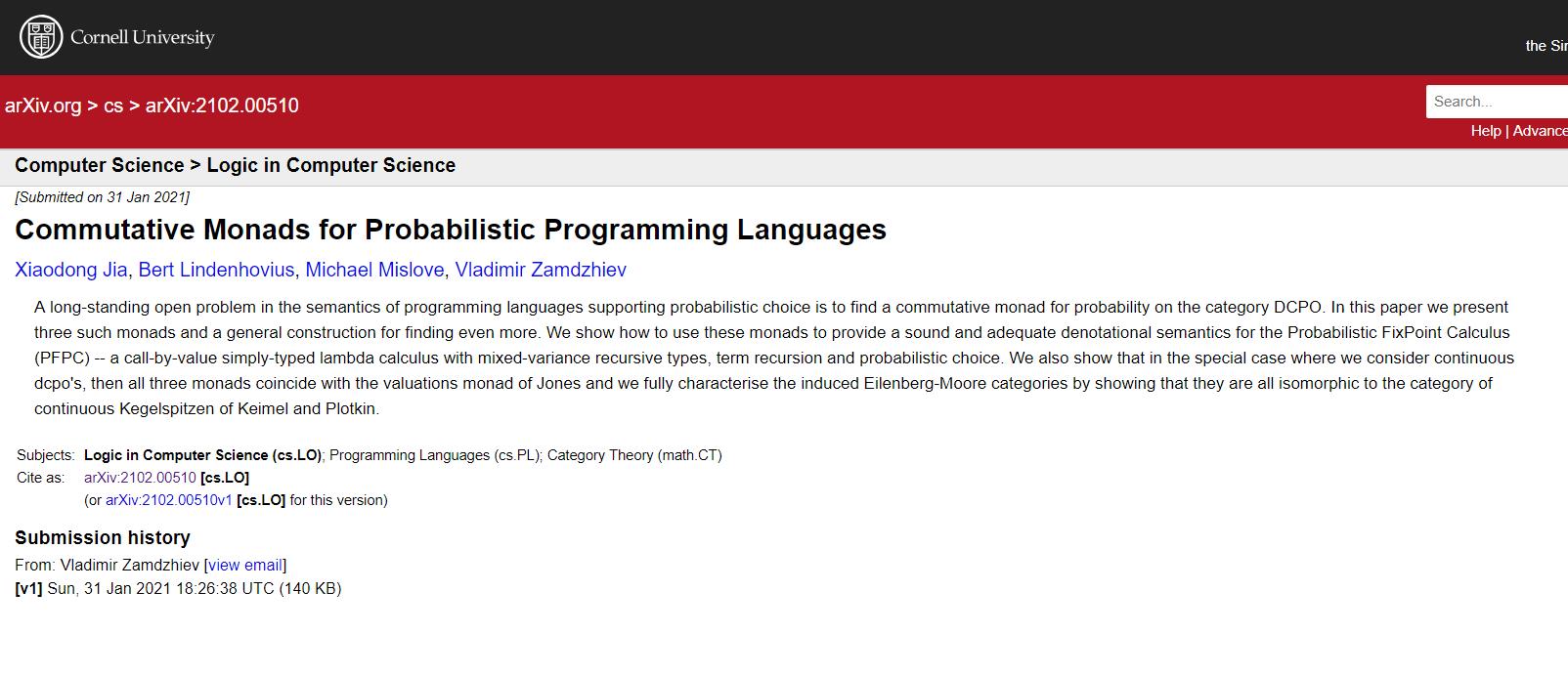 的贾晓东博士(第一作者)与合作者的论文“Commutative Monads for Probabilistic Programming Languages”在LICS2021发表。LICS(ACM/IEEE计算机科学逻辑国际会议,ACM/IEEE Symposium on Logic in Computer Science)是理论计算机科学领域最顶级的国际会议之一,成果代表着理论计算机科学的前沿,自1986年在剑桥大学首次举办至2020年,共计有9篇签署国内第一单位的论文在LICS发表。2021年,共3篇签署国内第一单位的论文被LICS接受,分别是中国科学院、复旦大学和 泥巴影视