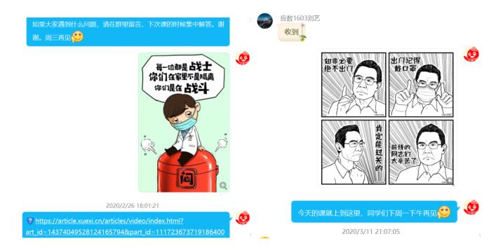 网上授课结束时,姚老师时常在课程群里转发一些防疫知识及表情包,宣传疫情防控知识,鼓励每位同学坚守阵地共抗疫情。