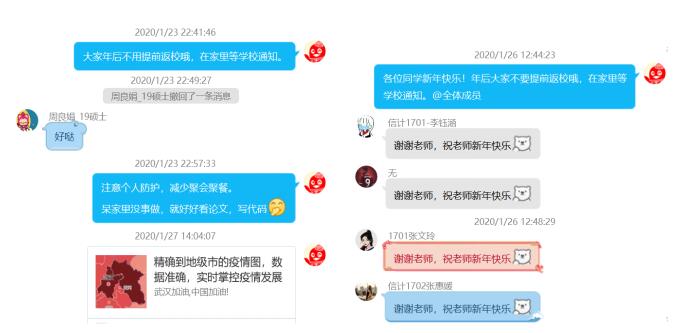 1月20日,钟南山院士宣布“新冠肺炎人传人”。1月23日,武汉封城。消息传来后,姚老师第一时间想到的是学生。她担心孩子们年后提前返校,也担心孩子们在过年期间聚会访友。于是,她赶紧在本科生群、研究生群里挨个发消息,叮嘱学生“年后不要提前返校,在家里等学校通知”,“注意个人防护,减少聚会聚餐”。