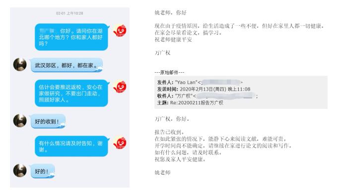 团队中的湖北学子是否安全,生活上是否方便,学习研究能否正常进行?姚老师时刻挂念疫情最严重地区的学生,常常关心与问候。她嘱咐学生如有困难一定要及时联系,鼓励学生克服眼前的困难,静心阅读文献,坚持自己的科研工作。