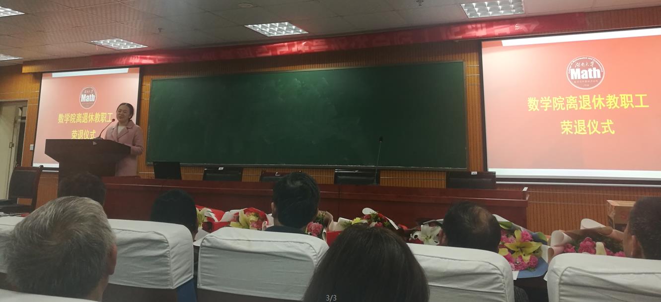 接下来欢送会进入高潮,八位退休教师上台,蒋月评院长和程卓蕾书记为每一位老师颁发了“光荣退休”的荣誉证书。年轻教师上台献花,这一幕意味着传承,数学院的接力棒也将逐步传递给年轻教师。献花结束后,胡跃荣老师作为退休教师代表上台,感谢学院领导和同事的关心。他说自己已经在湖大工作了一辈子,对 泥巴影视