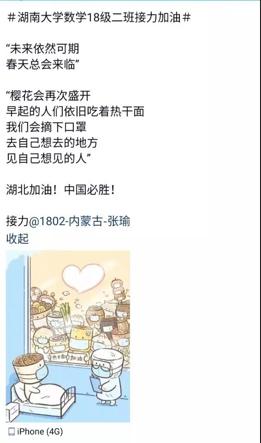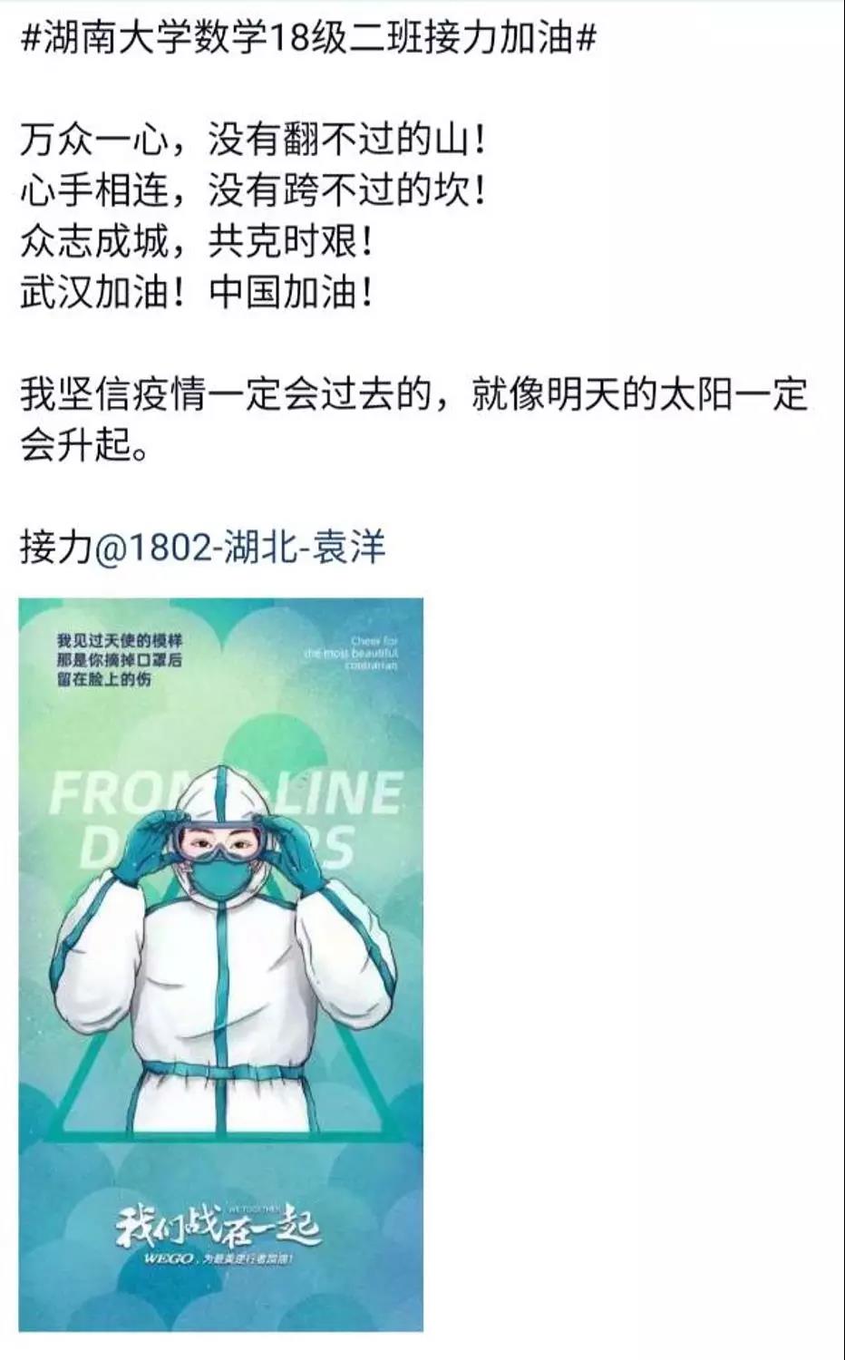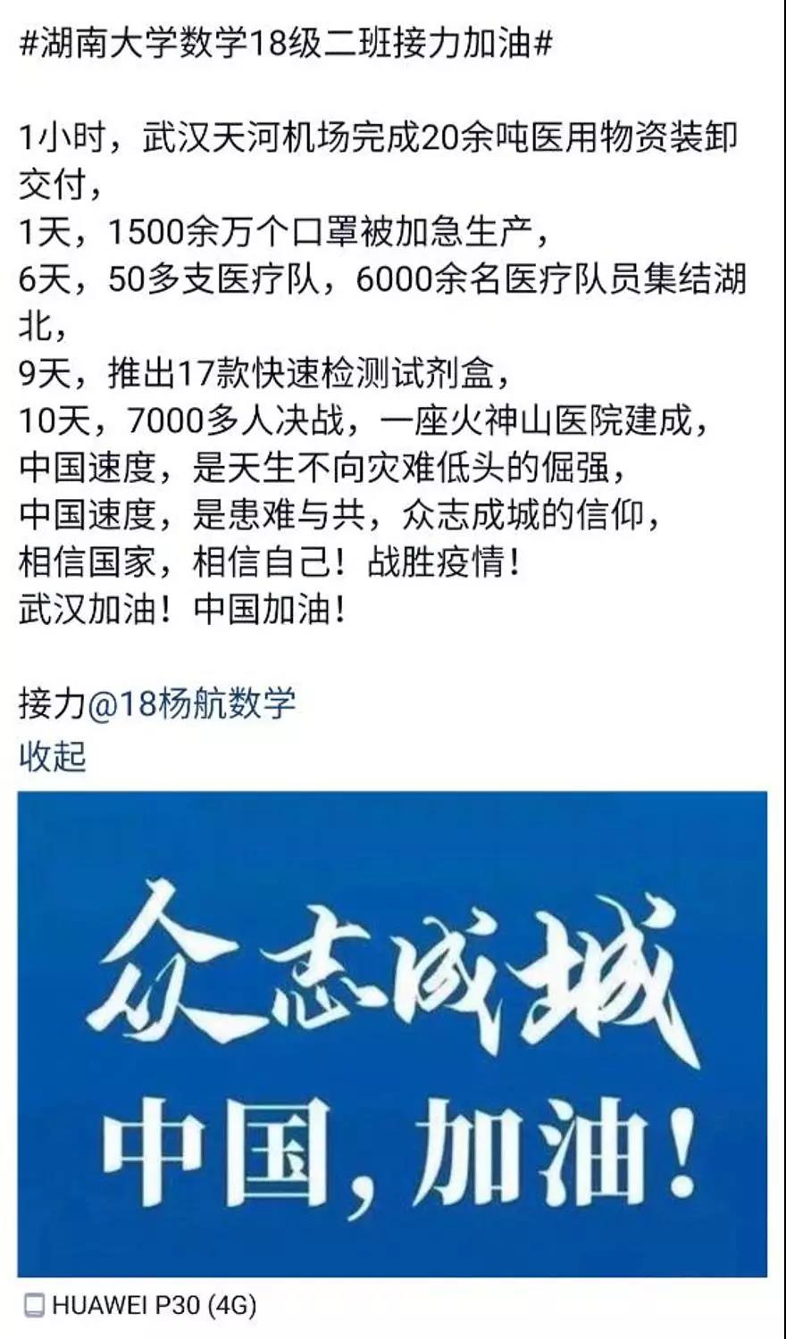 近日, 泥巴影视 数学院1802班的同学们自发组织了一场线上“接力加油“活动,为中国祈福,为武汉加油!