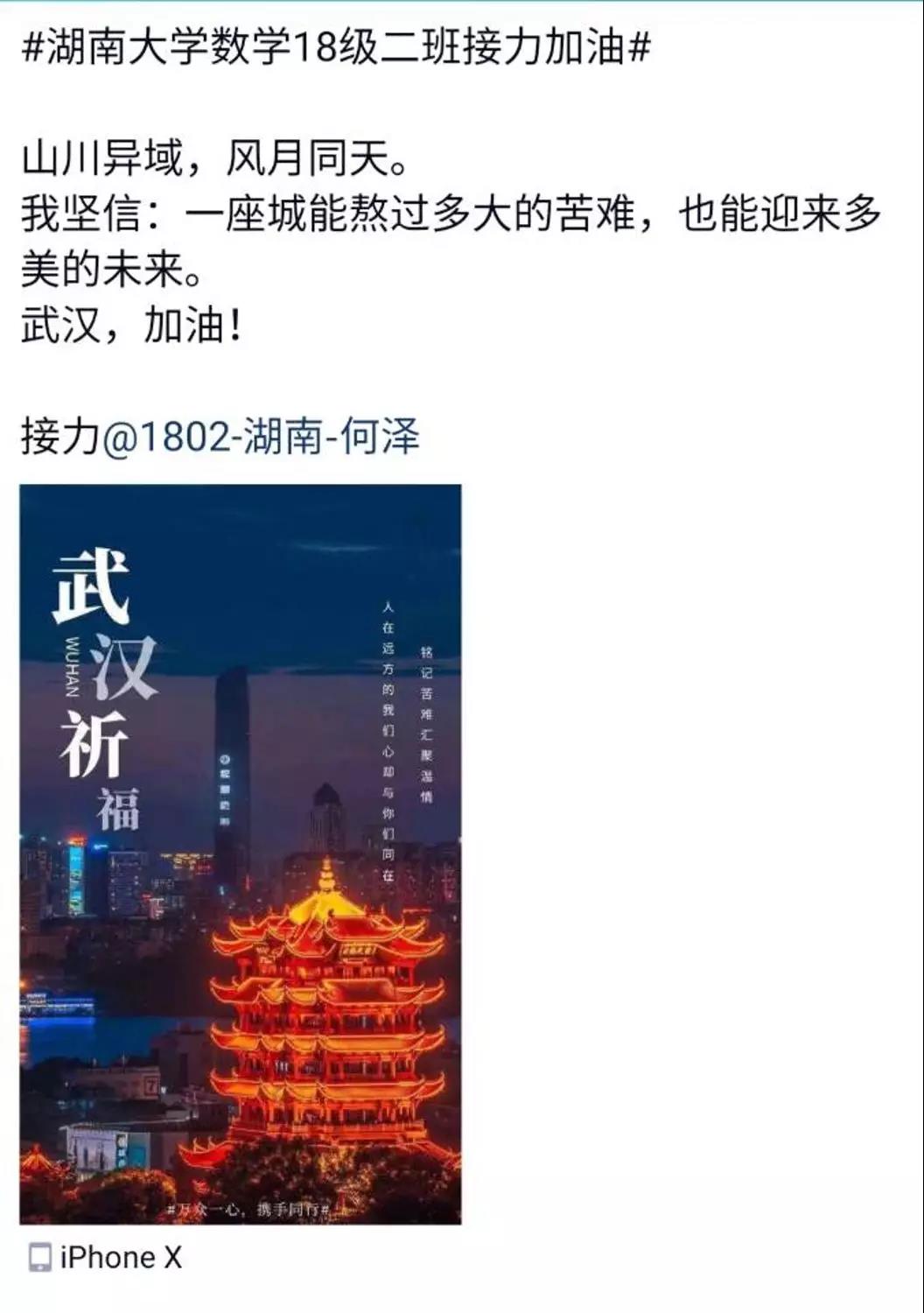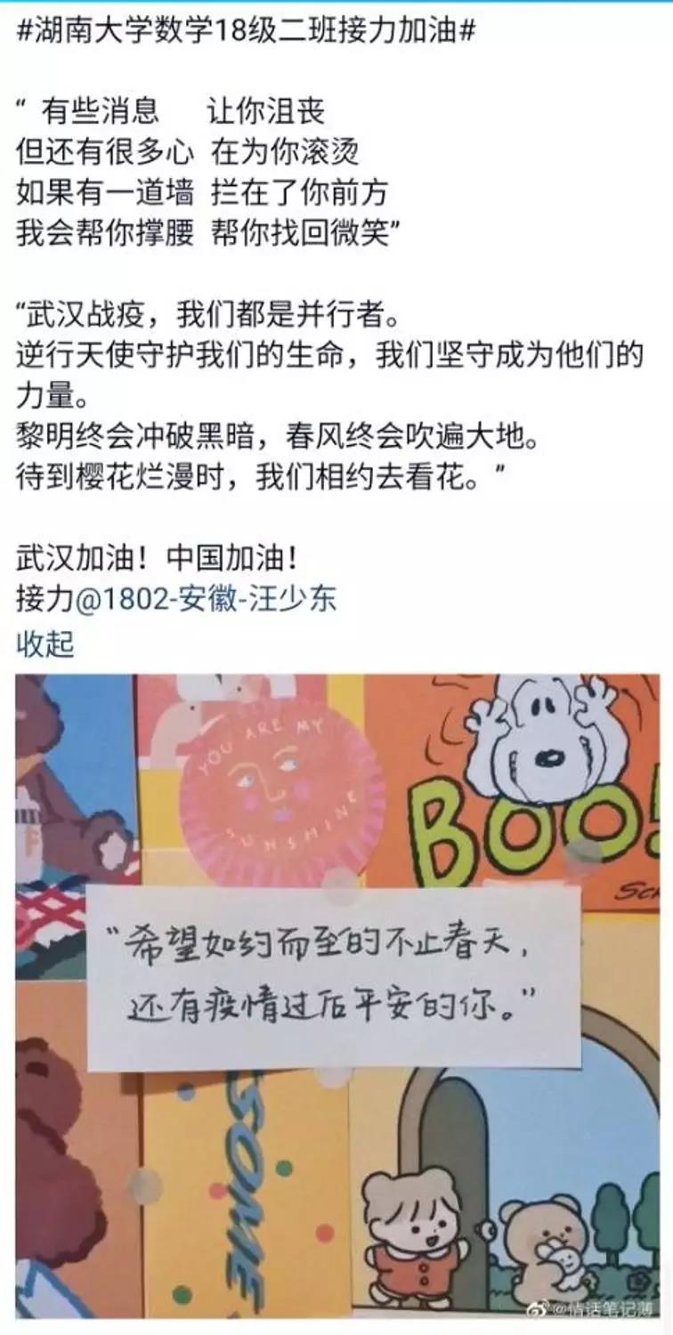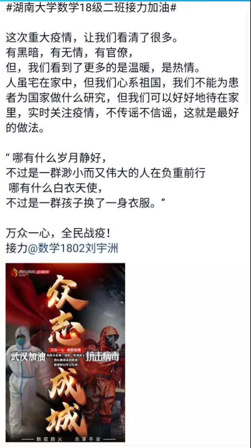 近日, 泥巴影视 数学院1802班的同学们自发组织了一场线上“接力加油“活动,为中国祈福,为武汉加油!