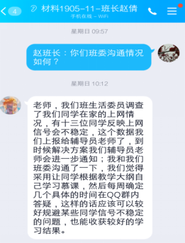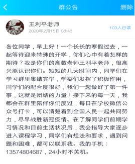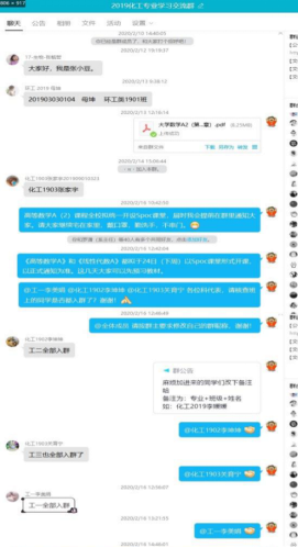 2月7日,任课老师按照班级创建学生课程QQ群。2月12日,学校向选课学生公布各课程班级QQ群,学生迅速入群。任课老师首先摸排学生,确保一个都不掉队,并了解严重疫区学生分布情况,统计同学的学习需求。然后上传电子版教材,提前开始QQ群答疑。