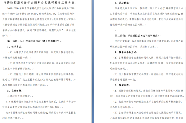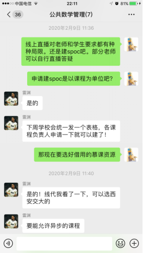 ★建设异步SPOC课程:2月9日,经过几天的摸索实践和集体讨论,确定课程主要采用异步SPOC在线教学的方案。2月9日至2月15日,课程负责人学习MOOC平台管理办法,组织试听了多门优质慕课,最后精选国防科技大学朱健民教授的国家精品慕课《高等数学》和山东大学的国家精品慕课《线性代数》作为课程源,并组织骨干教师建设异步SPOC课程:设计课程封面、编辑课程介绍与公告、增减课程内容、导入学生名单……经常加班到凌晨。
