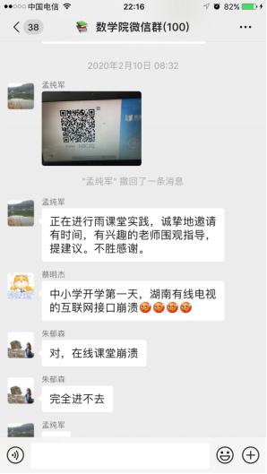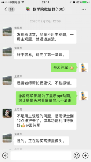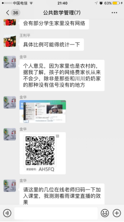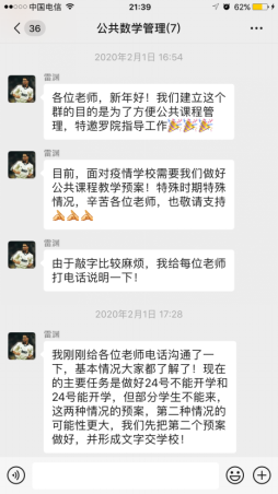 ★成立教学管理团队:2月1日(正月初八),学院召集公共数学系主要负责人商量疫情期间课程预案,通过电话、微信、QQ等多种方式——落实到每门课每位老师知悉,邀请有近40年教学经验的教学名师罗汉教授进行指导。大家在微信群中对在线教学的各种方式展开热烈讨论,老师们重点关注了偏远地区和疫情严重地区学生在线学习的问题和困难,并当场测试雨课堂直播效果。