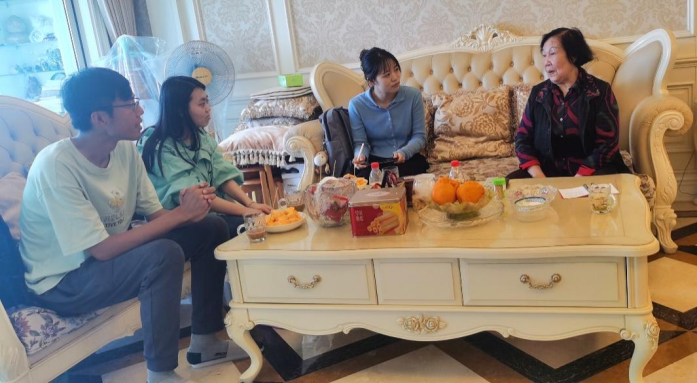 党办主任胡蕾同志、全国样板党支部——本科生第二支部成员龚添爱同志、唐家熠同志、王骞同志一同前往拜访学院退休老党员何灿芝老师。